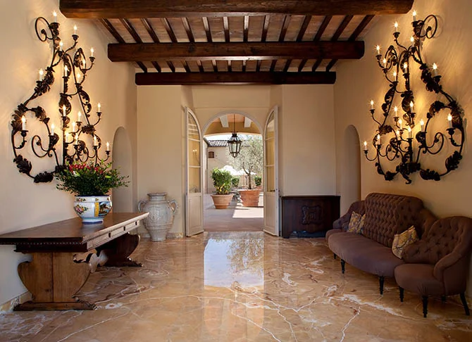The travel trunk harkens back to the glamour of old world travel, while the Circular nailheads in the center represented an icon of the Tuscan royalty, honoring this castle's history.