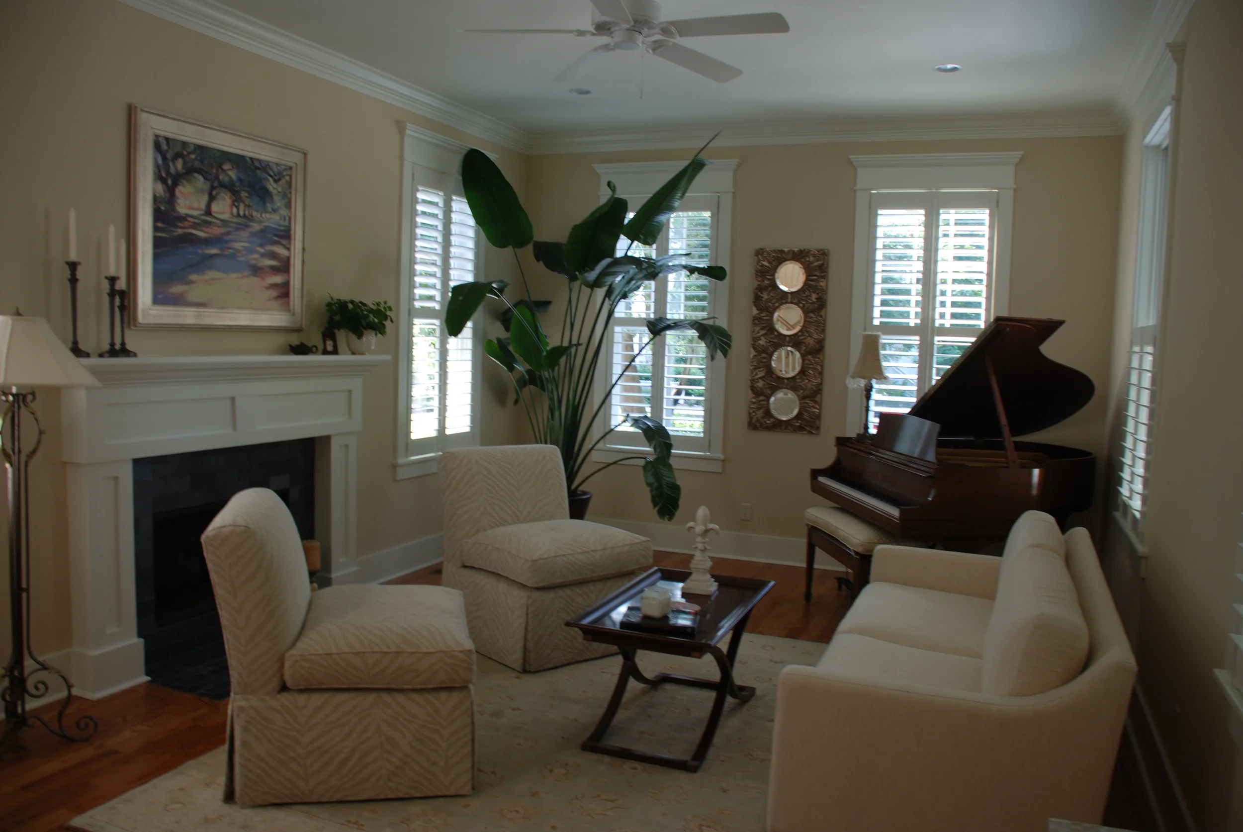 A Charleston row house, this space had an unusual space that made planning furniture difficult. The owner had a baby grand which was important to showcase, in addition to wanting to create a formal sitting area. Keeping with a neutral palette, we created a soft space highlighted by a luminescent giclee by a local Charleston artist.