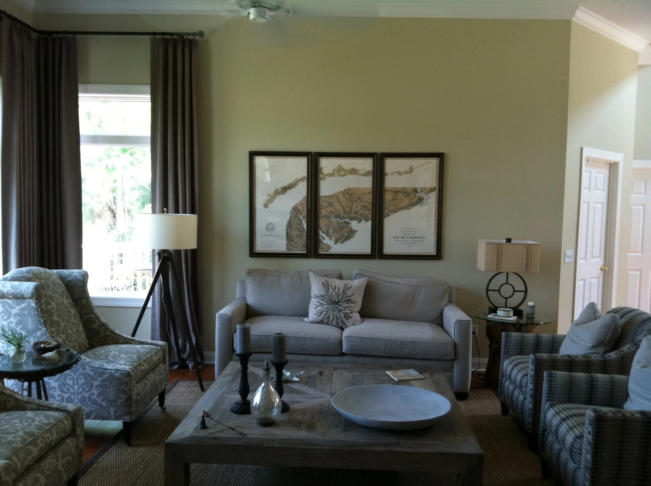 This beautiful Beaufort home sits on the water. The clients desire to showcase the local area comes in several different ways. A driftwood table appears as if its something they pulled in from the beautiful marsh of the lowcountry. The triptych map behind the sofa is of the area surrounding the home. A small side table was created from an old iron birdbath found at a local auction.